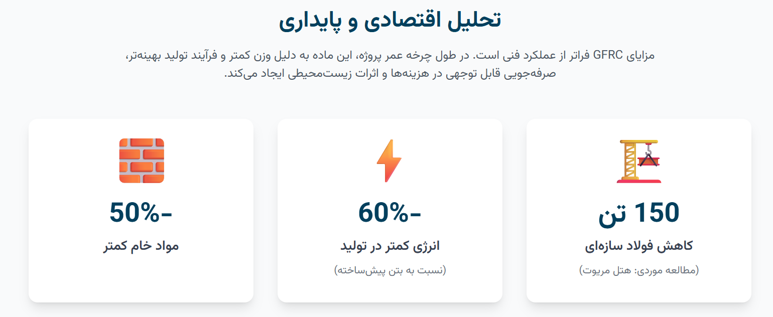 مصرف کمتر مواد خام: به دلیل ضخامت کمتر، GFRC به حدود 50% مواد خام کمتری (سیمان، سنگدانه) نیاز دارد. از آنجایی که تولید سیمان یکی از منابع اصلی انتشار دیاکسید کربن است، این کاهش مصرف تأثیر مستقیمی بر کاهش ردپای کربنی پروژه دارد.