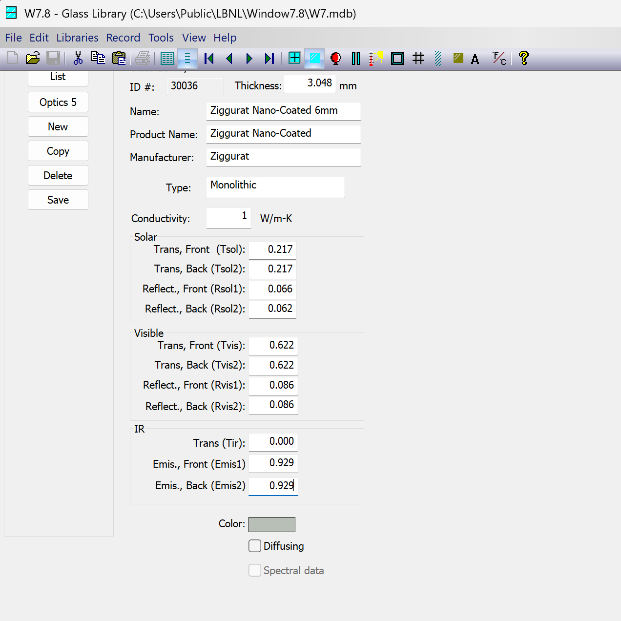 *** ZIGGURAT NANO-COATING GLASS DATA *** *** Based on Lab Results: Dec 2025 *** [GENERAL] Name: Ziggurat Nano-Coated Glass 6mm Type: Monolithic (Single Layer) Thickness: 6.0 mm Conductivity (k): 1.0 W/m-K (Standard Float Glass) [OPTICAL PROPERTIES - VISIBLE] Tvis (Transmittance): 0.622 Rvis Front (Reflectance Outside): 0.086 Rvis Back (Reflectance Inside): 0.086 [SOLAR PROPERTIES - ENERGY] Tsol (Transmittance): 0.217 Rsol Front (Reflectance Outside): 0.066 Rsol Back (Reflectance Inside): 0.062 [THERMAL PROPERTIES - IR] Tir (Transmittance): 0.000 (Opaque to Far IR) Emissivity Front (Coated Surface): 0.929 * Emissivity Back (Uncoated Surface): 0.840 ** * Note 1: Front Emissivity is based on the provided lab test result (0.929). * Note 2: Back Emissivity is assumed standard glass (0.84). If coating is applied on both sides, change Back Emissivity to 0.929.