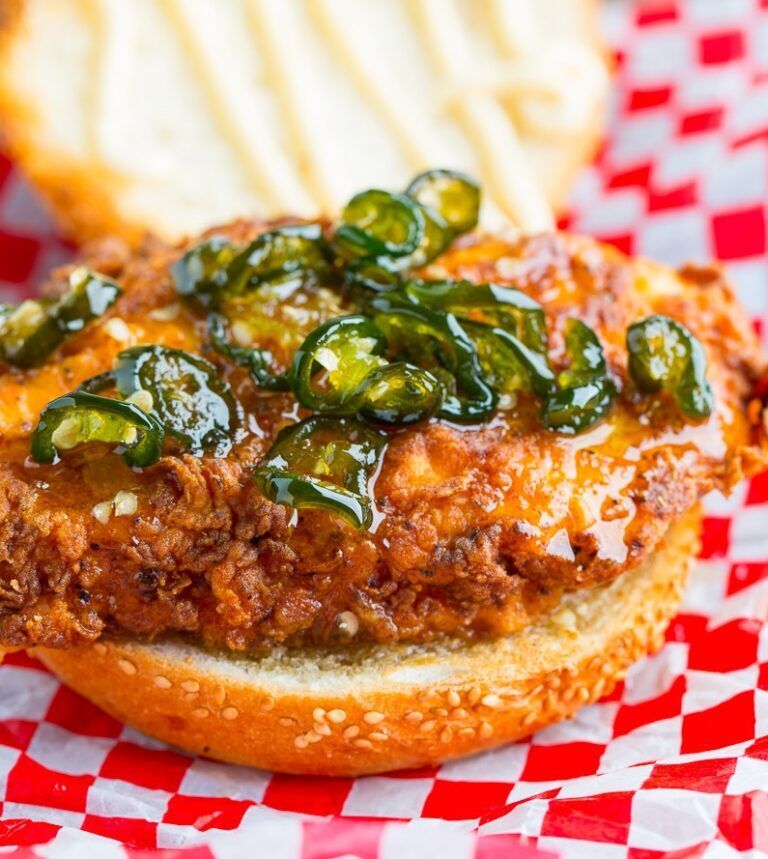 در اولین مرحله از طرز تهیه ساندویچ مرغ هالوپینو باید سینه مرغ خرد شده را داخل غذاساز یا میکسر بریزید تا کاملاً چرخ شود. سپس مرغهای له شده را در یک کاسه بریزید و پیاز رنده شده، پنیر چدار رنده شده، گشنیز، سیر، فلفل هالوپینوی میکس شده، زیره، نمک و فلفل را با هم ترکیب کنید. سپس یک دستکش بزنید و مواد را با دست خوب ورز دهید تا با هم مخلوط شوند. حال یک ماهیتابه گریل یا هر نوع ماهی تابهای که در دسترس دارید را با شعله ملایم روی گاز قرار دهید. سطح ماهیتابه را با کمی روغن چرب کنید. مواد ساندویچ مرغ را به ۴ قسمت تقسیم کنید. یک قسمت آن را بردارید و مثل همبرگر دست ساز گرد و پهن کنید و داخل ماهیتابه قرار دهید.