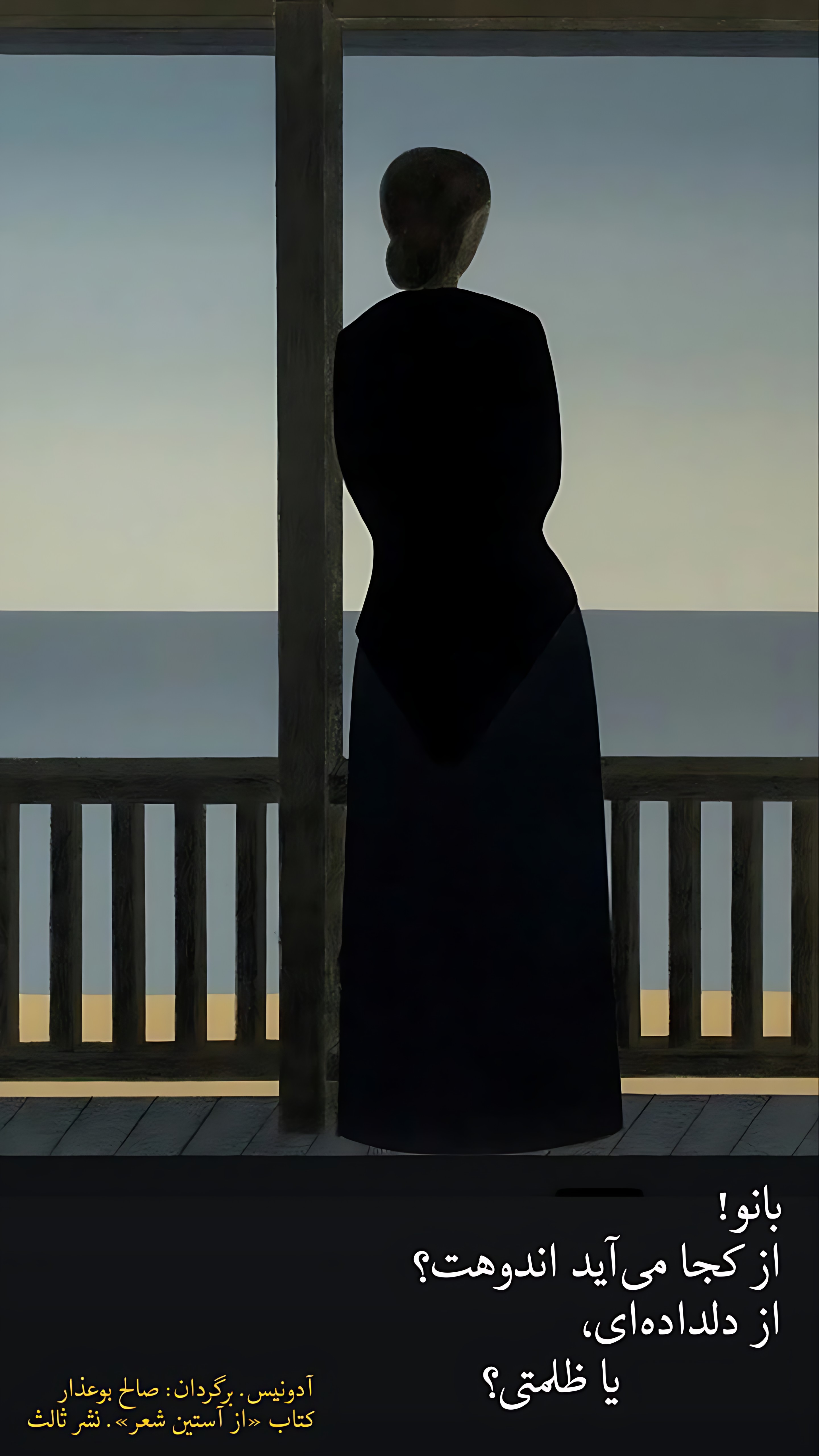 .بانو!از کجا میآید اندوهت؟از دلدادهای، یا ظلمتی؟#آدونیس#کتاب_از_آستین_شعربرگردان #صالح_بوعذار#نشر_ثالثچاپ پاییز ۱۴۰۲۴۵۶صفحه#از_آستین_شعر.http://B2n.ir/z87284لینک تهیه کتاب از وبسایت نشر ثالث 👆