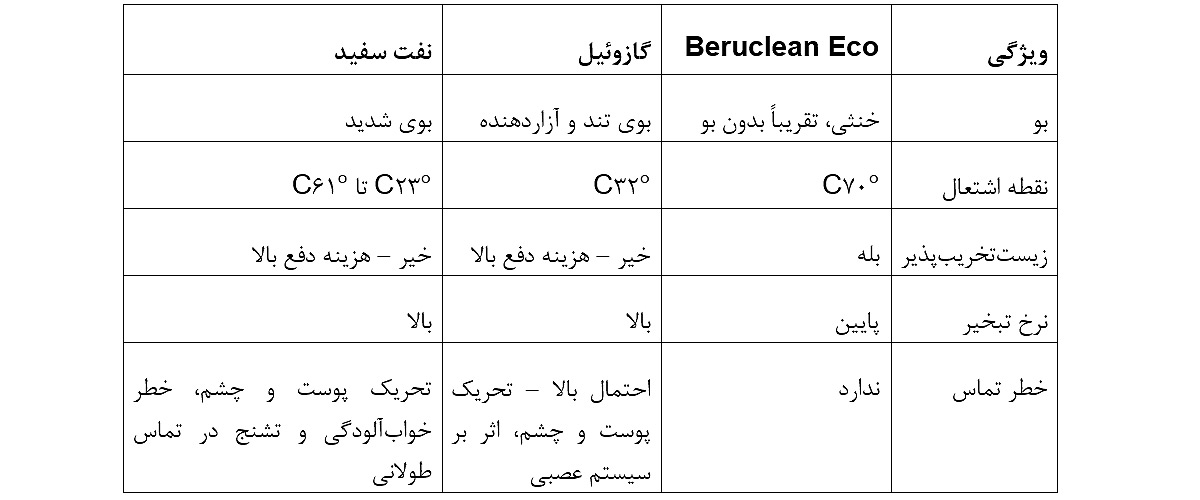 در این جدول، بهصورت دقیقتر، پاککننده Beruclean Eco را با دیگر پاککنندهها مقایسه میکنیم: