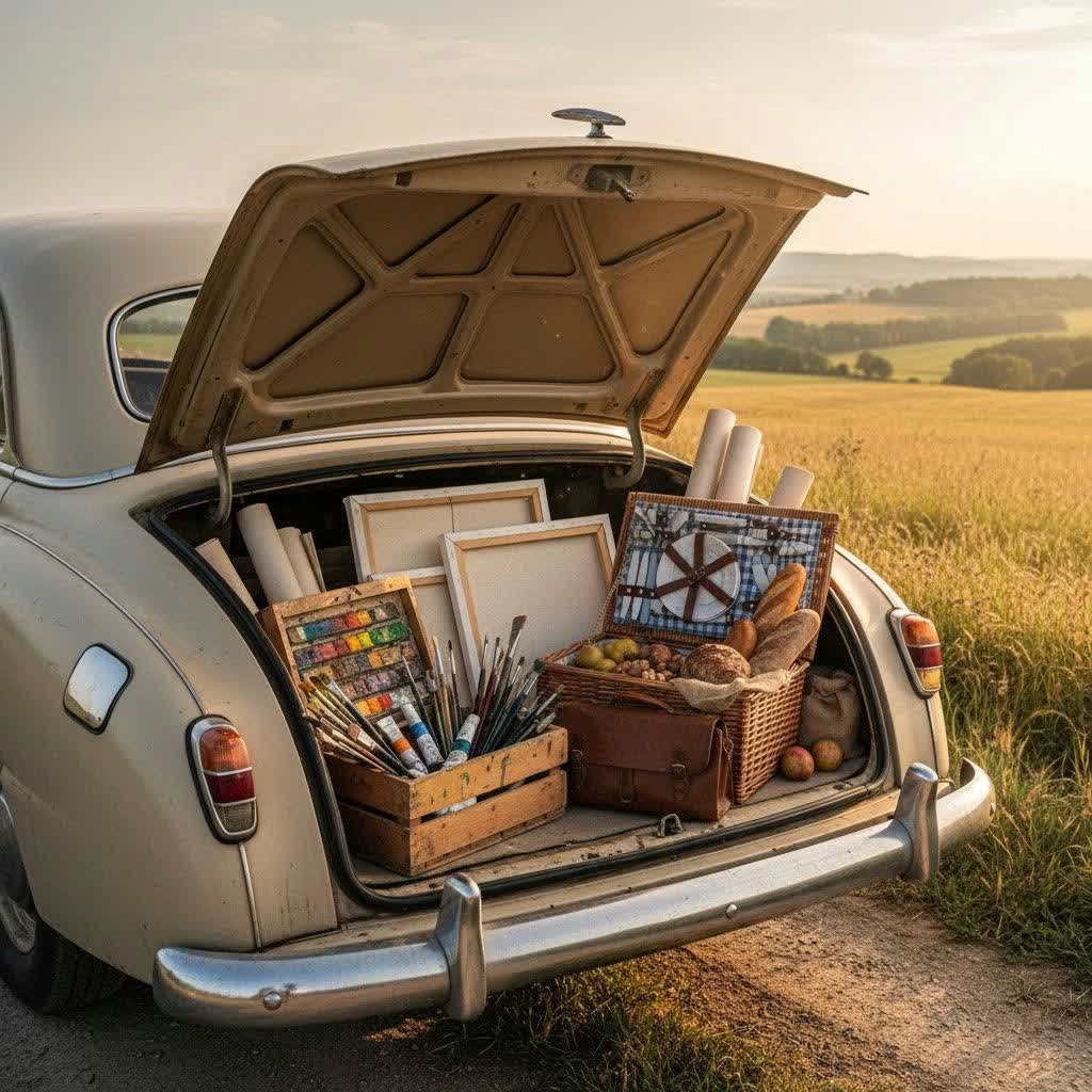 چند سال بعد، پدربزرگم درگذشت. یکی از اولین کارهای من، برداشتن کلید پیکان و باز کردن درِ صندوق عقب بود. همه چیز دقیقا همانطور بود: جعبهی رنگها، صندلی تاشو، و بومهای نصفه نیمهای که منتظر بازگشت دستان هنرمندش بودند.