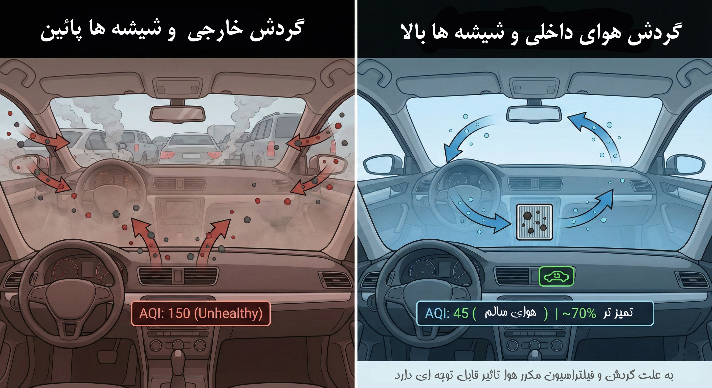 با فعال کردن این حالت، راه ورود هوای آلوده از بیرون بسته میشود و هوای موجود در کابین بارها و بارها از فیلتر خودرو عبور میکند. نکته حیاتی اینجاست: حتی اگر فیلتر خودروی شما یک فیلتر معمولی باشد (و نه یک فیلتر پیشرفته HEPA)، همین "عبورِ چندباره" و تکراری باعث میشود، آلودگی تا حدود ۶۰ الی ۷۰ درصد کاهش یابد. اگرچه به دلیل درزهای ریز بدنه خودرو، هوا " ۱۰۰٪ پاک" نخواهد شد، اما وضعیت تنفسی شما از "خطرناک" به "قابل قبول" تغییر میکند.
