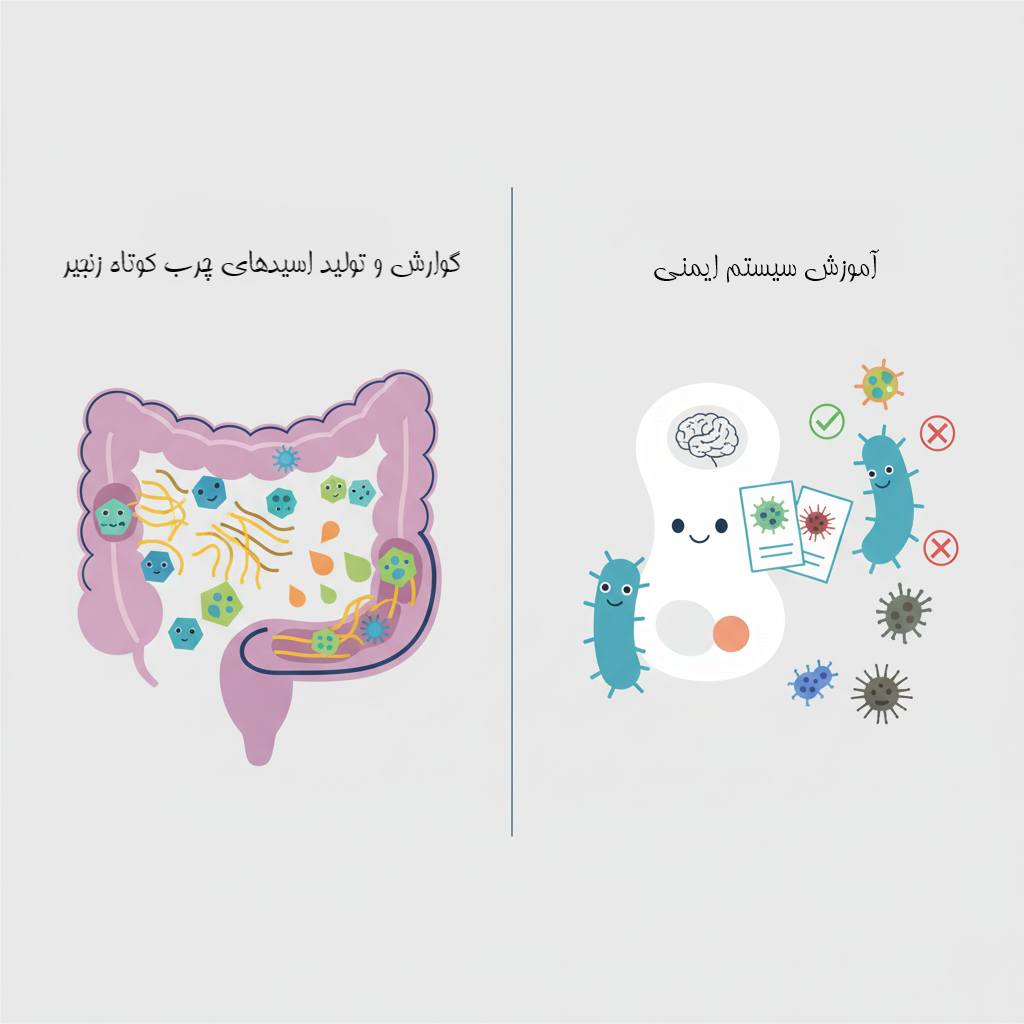 میکروبیوم در هضم فیبرها و تولید ترکیباتی به نام اسیدهای چرب کوتاهزنجیر، مانند بوتیرات، نقش دارد؛ موادی که دیواره روده را تغذیه میکنند و التهاب را کاهش میدهند (مطالعهی Louis و Flint، مجله Nature Reviews Microbiology, ۲۰۱۷). افزون بر آن، این میکروبها به سیستم ایمنی آموزش میدهند که میان دشمن و دوست تمایز قائل شود. نوزادانی که در ماههای نخست زندگی در تماس متعادل با میکروبها نیستند، در آینده بیشتر مستعد آلرژی و آسماند (مطالعهی Strachan، BMJ, ۱۹۸۹).