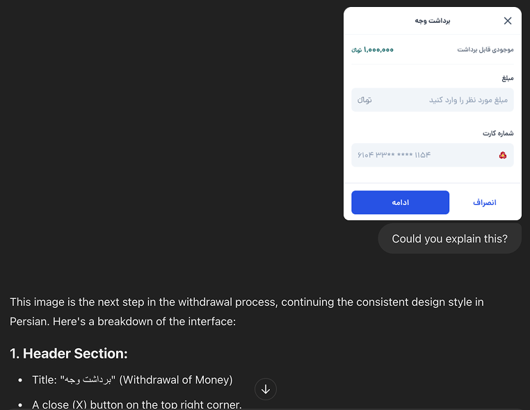 یکی از بهترین تجربههایی که میتونید داشته باشید وقتیه که وقتی فکر میکنید طراحیتون تقریبا نهایی شده، اون رو برای chat-gpt ارسال کنید و ازش بخواید کارتون رو توصیف کنه و نکات ux ای که میتونه برای بهبود پیشنهاد بده رو بگه. شگفتی رو اینجا متوجه خواهید شد که دقیقا مثل یک همکار (البته تازه کار و کمی خنگ) تحلیل و ایده مطرح خواهد کرد.