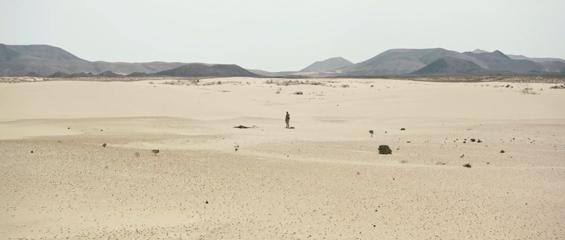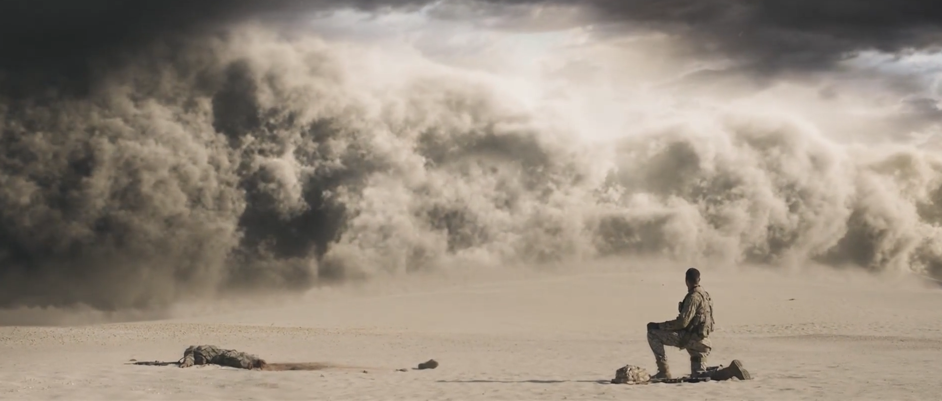 دوربین به سرعت از مایک دور می شود و قابی زیبا و ترسناک از وسعت بیابان و حس تنهایی بی انتهایی شکل می گیرد. کمی بعد به این قاب طوفانی سهمگین از شن هم افزوده می شود.