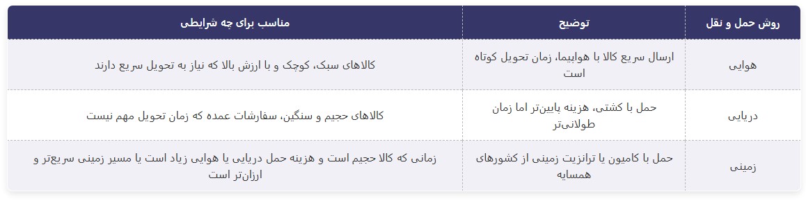 روش حمل را با توجه به حجم و هزینه انتخاب کنید: هوایی یا دریایی