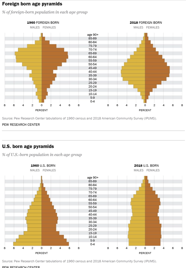 نمودار 7: مقایسه ترکیب سنی جمعیت محلی و مهاجر در سالهای 1960 و 2018 (Budiman, A., Tamir, C., Mora, L., Noe-Bustamante, L. 2020)