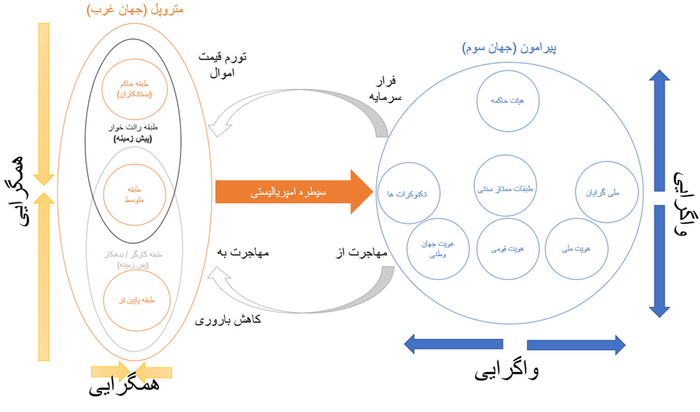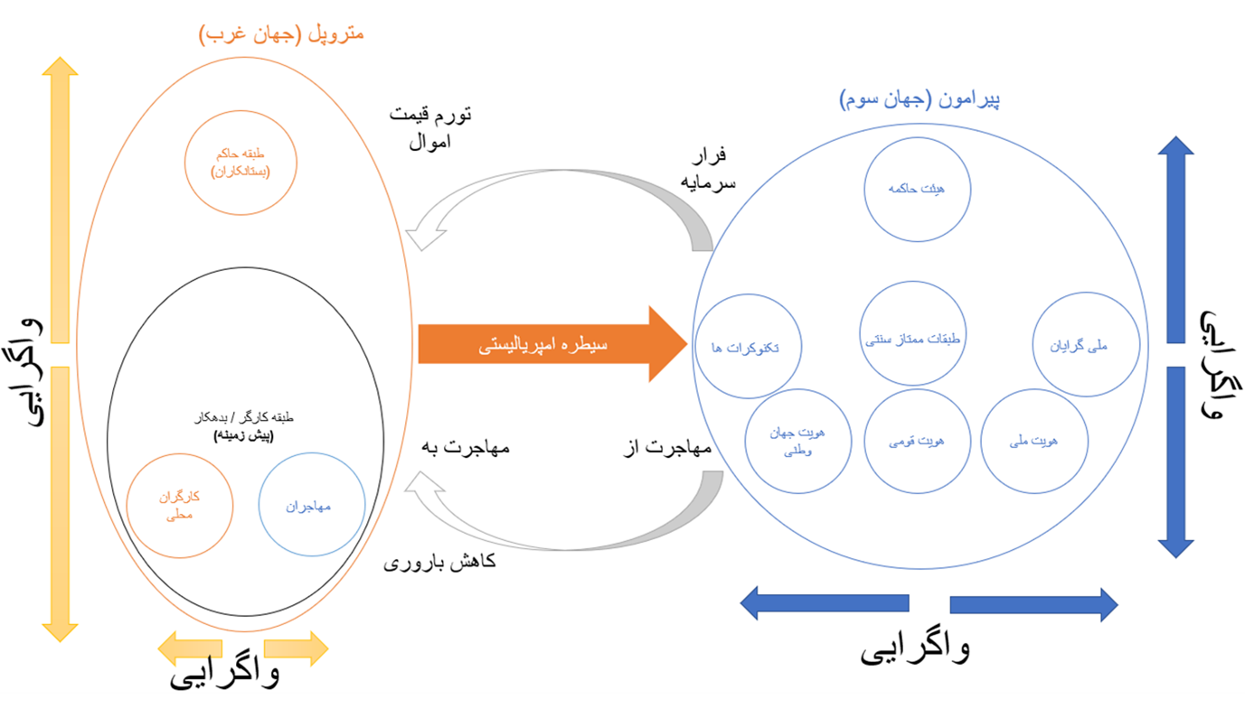 قدرت هژمونی جهانی آمریکا و متروپل های نولیبرالیسم به مانند یک نیروی مغناطیسی موجب اعوجاج بافت اجتماعی جوامع پیرامونی می شود. بعلاوه، سیاستهای نولیبرال از طریق سیطره امپریالیستی ایالات متحده در دستور کار سایر جوامع و دولتهای جهان سوم قرار می گیرد، بطوریکه از طرفی این هژمونی فرهنگی حفظ و بازتولید شده و از طرف دیگر نهایتا جهت جریان حرکت سرمایه و نیروی کار به سمت آمریکا و دیگر متروپل های سرمایه داری نولیبرال قرار گیرد.