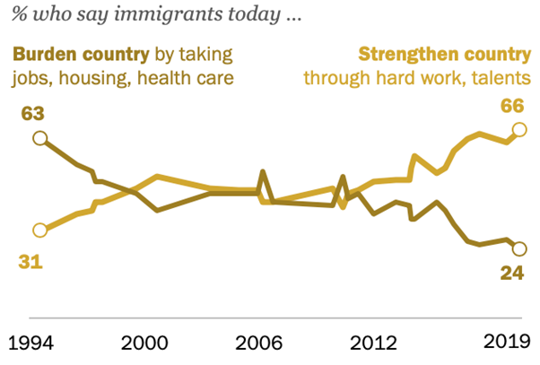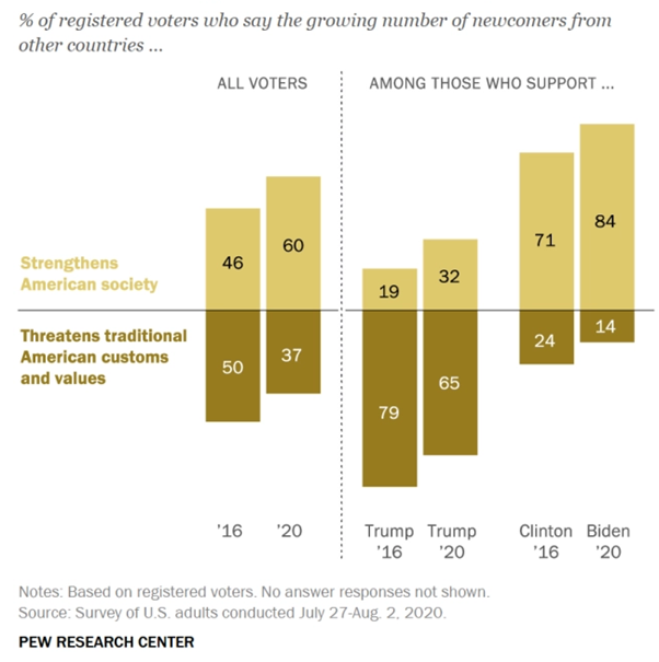 نمودار 8: درصد آمریکاییهایی که حضور مهاجران را مثبت یا منفی ارزیابی می کنند (Budiman, A. 2020)