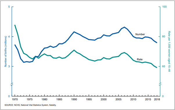 نمودار 5: تعداد تولدهای زنده و نرخ باروری: ایالات متحده از 1970 تا 2018 (Martin , J. A., Hamilton, B. E., Osterman, M. J. K., Driscoll, A. K., 2019)