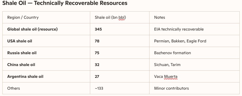 ملاحظه می شود که بیشترین ذخایر نفت شیل جهان در اختیار آمریکا است. و بلافاصله پس از آمریکا با فاصله کمی روسیه قرار دارد. این دو به تنهایی تقریبا نیمی از ذخایر نفت شیل جهان را در اختیار دارند.