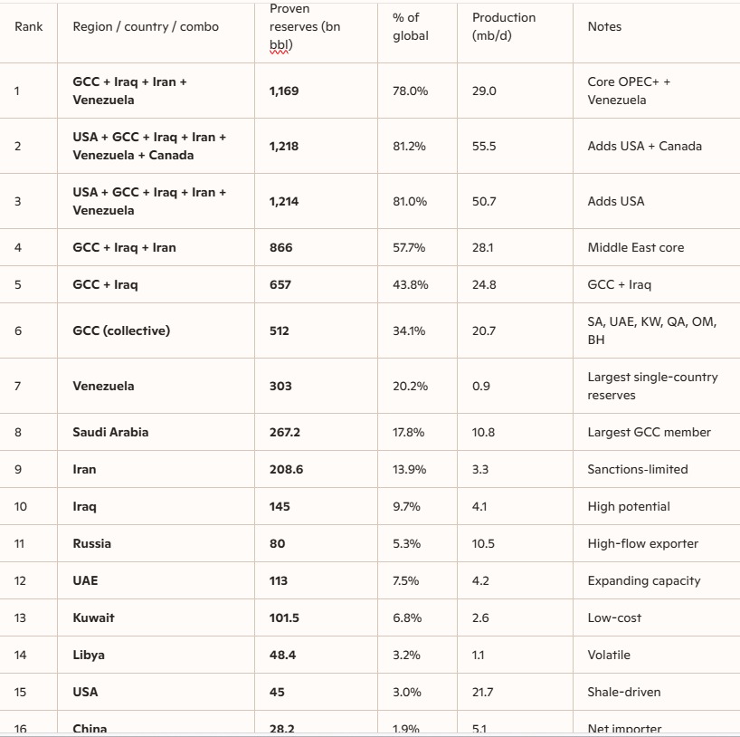 اگر آمریکا، مجلس تعاون، ونزوئلا، ایران و عراق را در یک بلوک قرار دهیم، 81% از ذخایر نفت جهان در این بلوک قرار می گیرد.