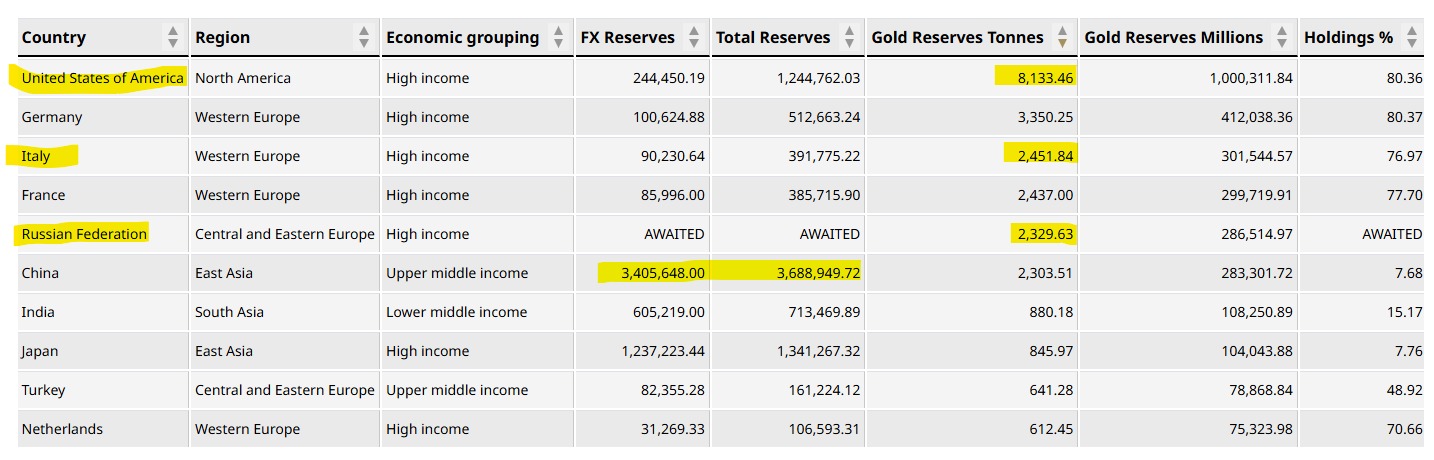 چین در جایگاه ششم قرار دارد. لیکن نکته جالبتر اینجاست که ذخایر آمریکا عمدتا از جنس طلا است و ذخایر دیگر آن در مقابل طلا ناچیز است. در حالی که بخش اعظم ذخایر چین از جنس دلار آمریکا بوده و ذخایر طلای چین نه تنها در مقابل ذخایر طلای آمریکا، بلکه در مقابل ذخایر دلاری خود چین هم بسیار ناچیز است.
