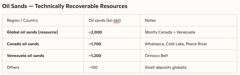ملاحظه می شود که تقریبا تمام ذخایر نفت شن جهان در دو کشور کانادا و ونزوئلا متمرکز شده است. یعنی آمریکا با در اختیار گرفتن افسار ونزوئلا و سپس کانادا، حتی بر منابع نفت شن هم مسلط خواهد شد.