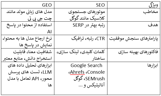 در ادامه تفاوت GEO و SEO را در قالب یک جدول برای شما آورده ایم تا بهتر بتوانید این دو مورد را با یکدیگر مقایسه کنید.