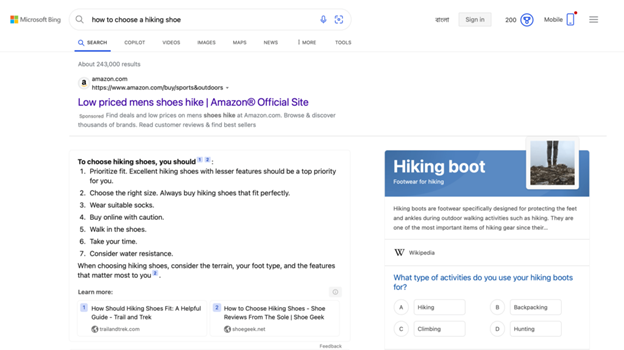 موتور جستجوی مایکروسافت بینگ جعبه پاسخ را در یکی از بالاترین موقعیت ها در نتایج جستجوی اولیه دارد، اگرچه ممکن است در موقعیت صفر نباشد. پاسخ های ارائه شده توسط هوش مصنوعی به طور میانگین به ۲ تا ۳ منبع لینک می دهند.