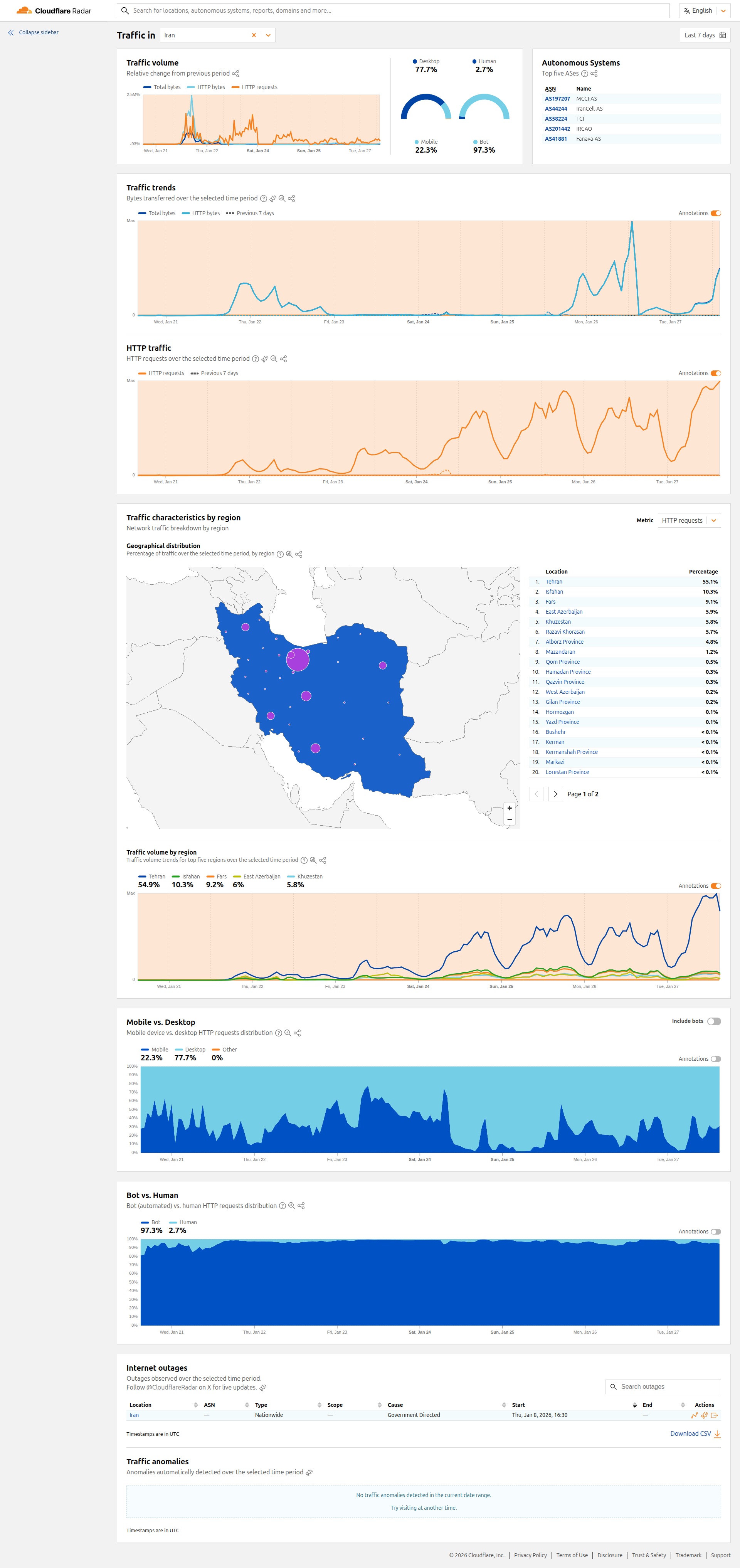 یکی از موضوعات این روزها در دیدار دوستان و گفتگوهای تلفنی، این است: خدارو شکر اینترنت من وصل شد، اینترنت شما چطور! در تصویر زیر گزارش کلودفلر از وضعیت اینترنتی ایران را میبینید: