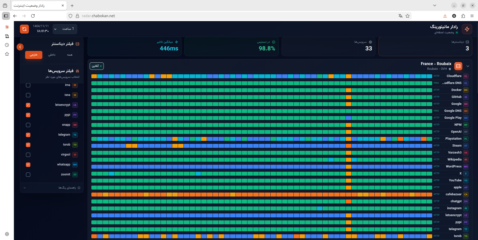 در زیر تصویر رادار دسترسی به اینترنت خارج در دیتاسنترهای چابکان را میبینیم: