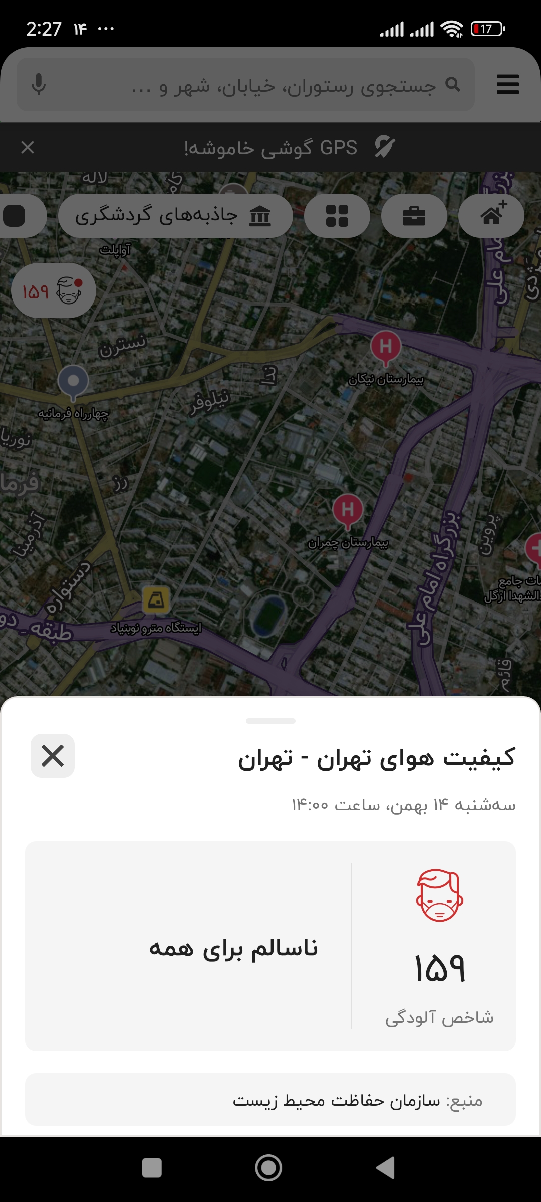در جستجوی مسیر بودم که متوجه شدم اپلیکیشن بلد میزان کیفیت هوا را اعلام میکند. به شهر تهران آمدم و دیدم بله همانطور که درباره قم اعلام کیفیت هوا میکرد، برای ته آن نیز میزان آلودگی هوا را واقعی اعلام کرد.