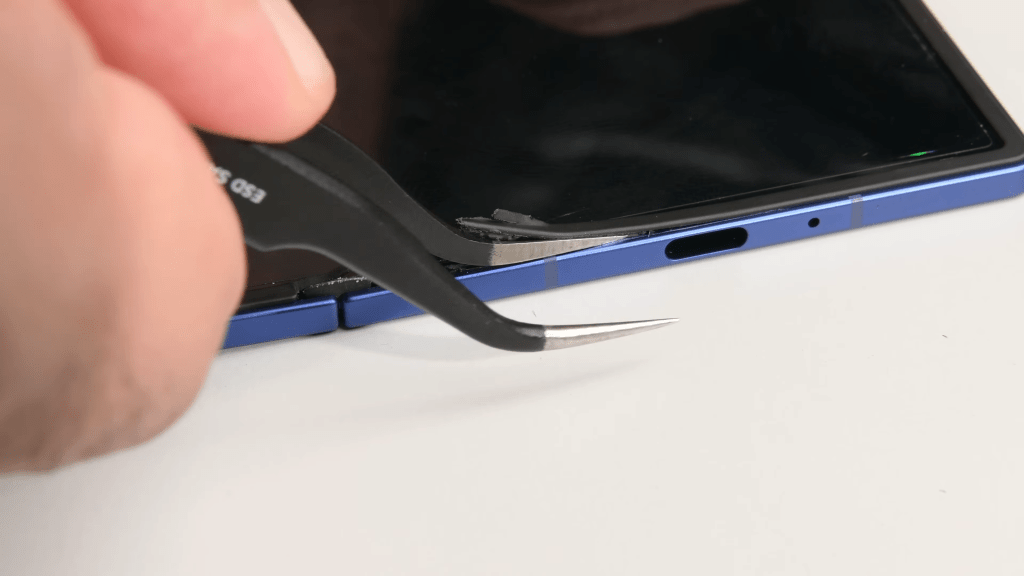 کل این فرآیند به اندازهای دشوار است که احتمالاً میتوانید تعویض این باتری را خودتان فراموش کنید، اما هیچ ربطی به جداسازی صفحه نمایش داخلی ندارد. iFixit مستقیماً به صفحه نمایش خمشونده گرما اعمال میکند، اما ابتدا باید قاب لاستیکی را جدا کرد و با انجام این کار، کل حلقه را با موچین نوکتیز از هم جدا میکند. یک دور دیگر گرما باعث شد صفحه نمایش فولد ۷ - ظاهراً با کمی سهولت بیشتر از حد معمول - از جای خود بلند شود، اگرچه iFixit توصیه میکند این کار را فقط با صفحه نمایشی انجام دهید که از قبل کاملاً شکسته است، زیرا پنلهای فعال نمیتوانند پیچش لازم برای جدا کردن آن از قاب را تحمل کنند.