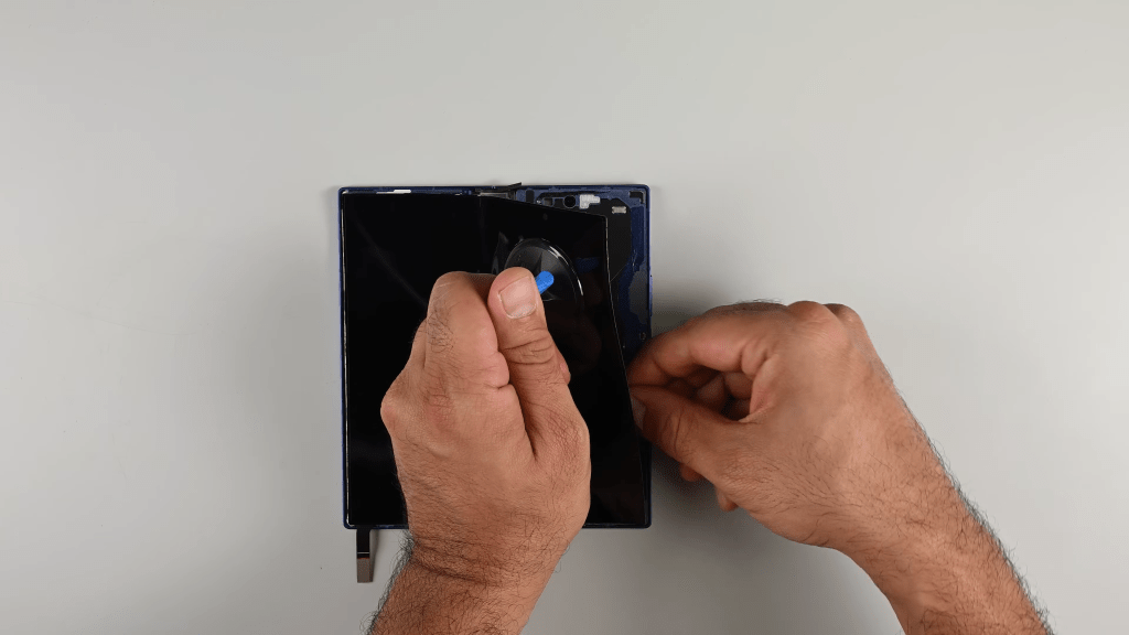 این فرآیند با روش نادرستی آغاز میشود، به طوری که تلاش برای برداشتن نمایشگر خارجی، در واقع پنل پشتی را قبل از شروع به تکان خوردن از شاسی جدا میکند. ظاهراً این یک الگو برای گلکسی Z Fold 7 است، زیرا ویدیوی دوام JerryRigEverything نیز منجر به جداسازی سریع در طول آزمایش خم شدن شد. iFixit به جای تلاش برای ادامه کار با صفحه نمایش جلو، توجه خود را به پنل پشتی معطوف کرد، همه اینها در تلاش برای تعویض یکی از قطعات بسیار مورد تقاضا که ارزش تعویض دارد: باتری.
