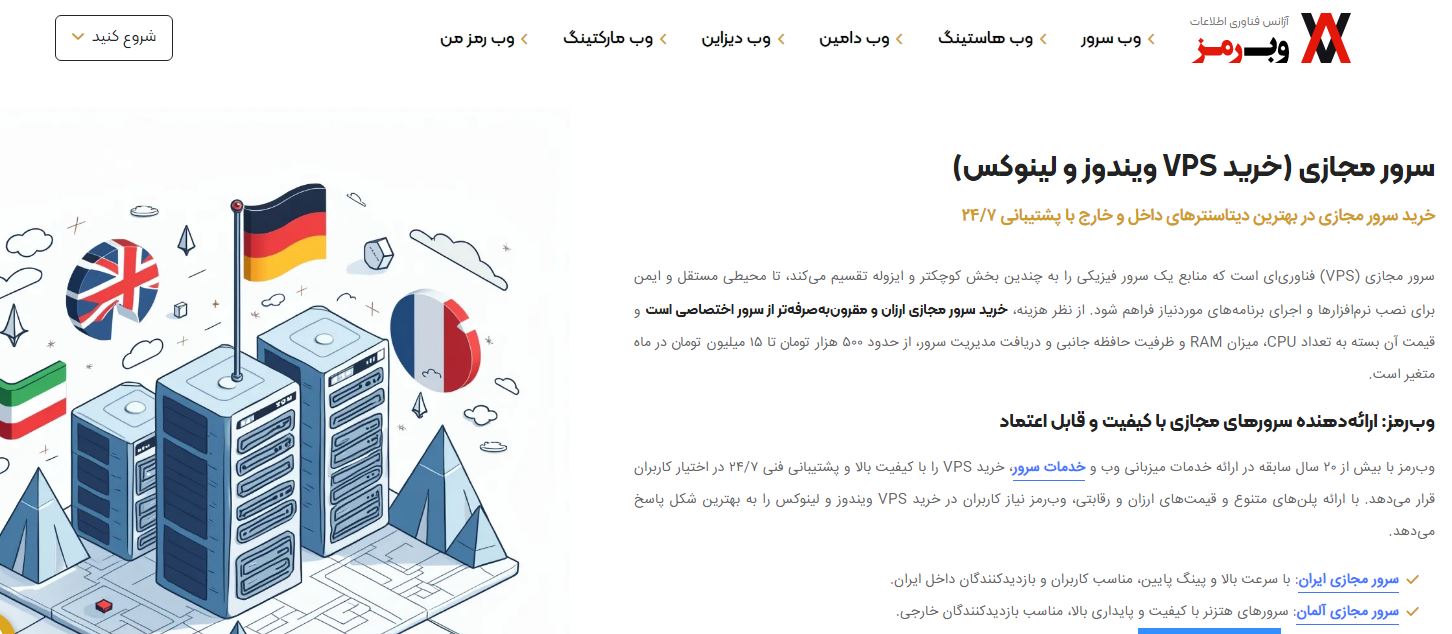 وب رمز یکی از بهترین سایتهای خرید VPS با سرورهایی در دیتاسنتر هتزنر آلمان، پارس آنلاین ایران، OVH و آمازون است. سرویسها به دو صورت مدیریت شده و مدیریت نشده ارائه میشوند.