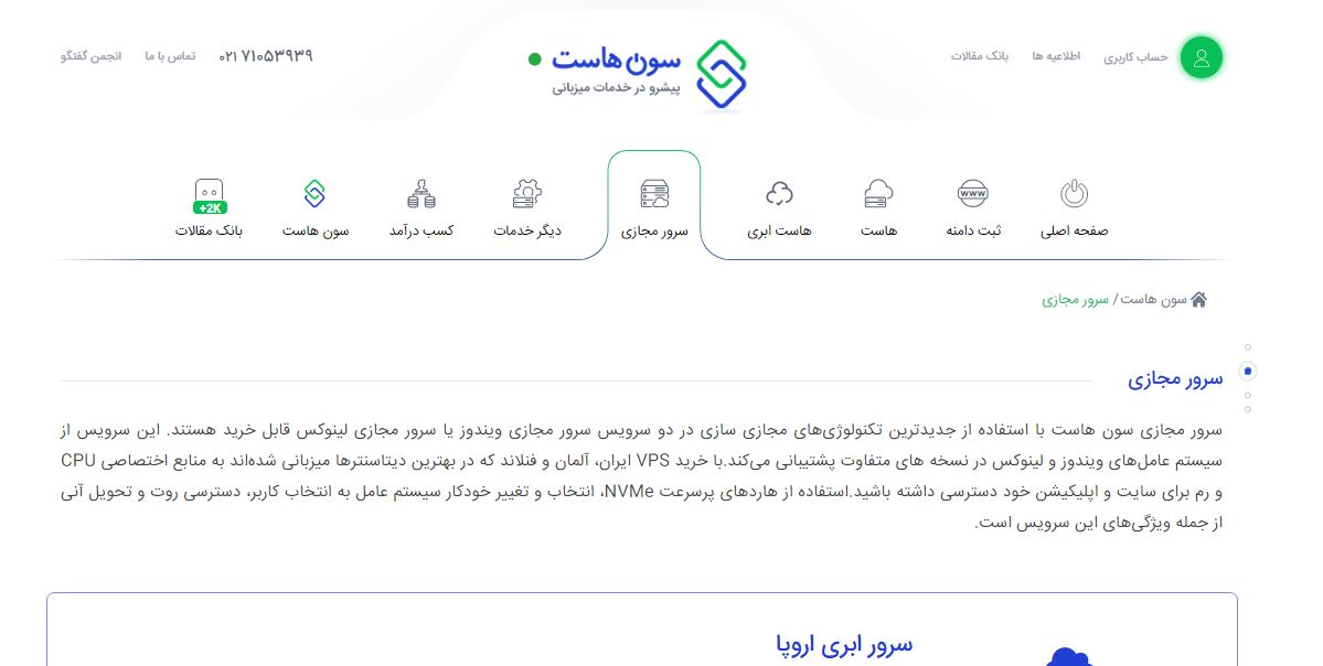 سون هاست از ارائهدهندگان خوب سرور مجازی در ایران است؛ این مجموعه سرور مجازی را در قالب ۴ محصول اصلی ارائه میدهد: سرور ابری اروپا، سرور مجازی حجیم، سرور مجازی ایران، سرور مجازی آلمان