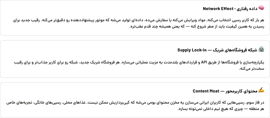 مشکل مرغ و تخممرغ: بدون رسپی کافی، کاربر نمیآد — بدون کاربر محتوا تولید نمیشه. جواب: در فاز اول محتوا توسط تیم داخلی یا اینفلوئنسرهای آشپزی تولید میشه. UGC فاز بعدیه.