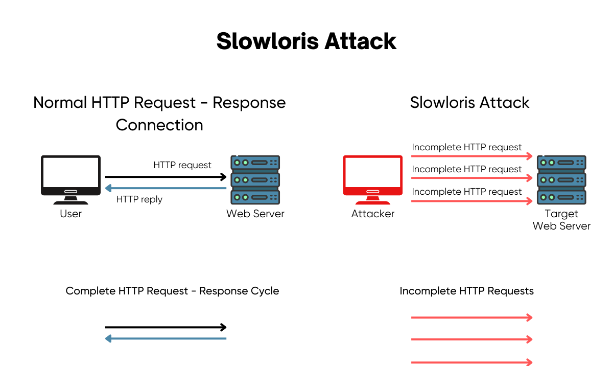 Slowloris با باز کردن تعداد زیادی اتصال HTTP به سرور، اما ارسال دادهها به صورت بسیار آهسته و تدریجی، سرور را به چالش میکشد: