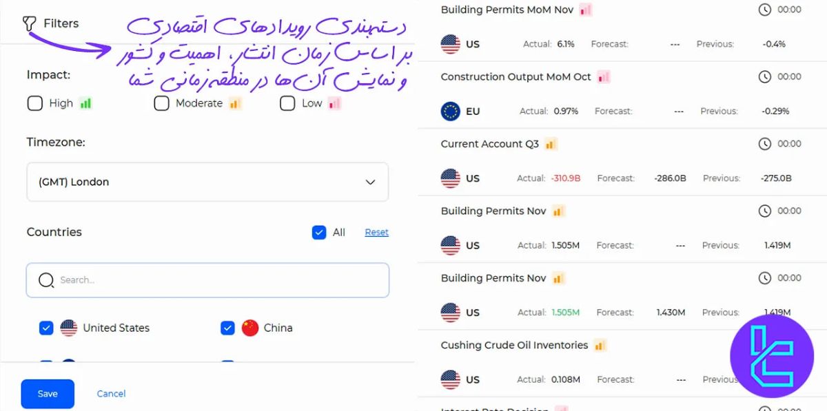 افزونه تقویم اقتصادی فارکس، ابزاری مبتنی بر مرورگر است که به راحتی با پلتفرم معاملاتی شما ادغام میشود. این ابزار نمای کلی از رویدادهای اقتصادی پیشرو را ارائه میدهد، از جمله: