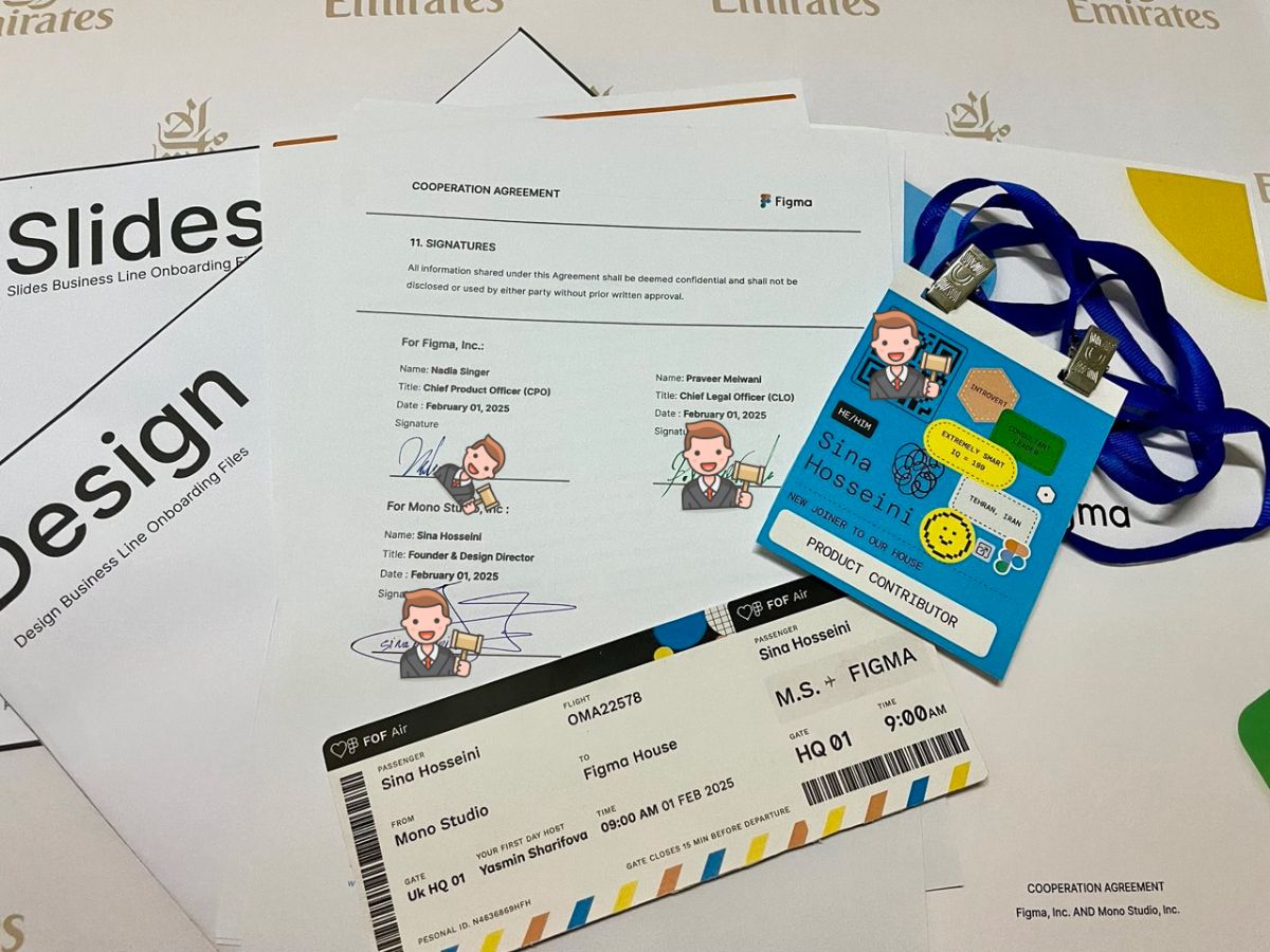 اولین جلسه ای که می روید با HRBP هست که مجددا در مورد شرکت ، قوانین ، فرهنگ سازمانی توضیح داد به صورت کامل ، برای من جذابیتش این مورد بود که توضیح داد که در فیگما به همه رنگ ها ( رنگین پوست ها ) ، ادیان و مذاهب ، گرایشات و… احترام می گذاریم ، تمام شرکت اوپن آفیس هست، بدون هیچ گونه تفاوت و… ، در شرکت هیچ چیز محدود کننده ای ندارند ، می تونین با همکارتون تو رابطه باشید ( ولی نباید در یک تیم باشین)، با شلوارک بیایین شرکت و… ، برای همین عکاسی در محیط شرکت ممنوعه و برای عکس گرفتن باید هماهنگ کنین حتما ( تو نت هم سرچ کنین فقط در زمان مراسمات عکس ها و مقالاتی از فیگما هست )، یک پوشه که قراردادتون ، یک بلیط نمادین که یادآوری می کنه از FOF اومدین به فیگما و یک پاسپورت نمادین FOF ( کارت خوش آمدگویی هم هست )
