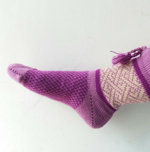 بافتن جوراب را اولین بار از دوستم که دانشجوی مجسمه بود یاد گرفتم ، علاقه عجیب من به جوراب باعث شد به سرعت یاد بگیرم و شروع به زدن طرح های خلاقانه و بافت انواع مختلفی از آنها کنم .ابتدای کار چندان راحت نبود در سایز بندی ها دچار مشکل میشدم و وقتی نخی را به کار اضافه می کردم گره های کاموا را به جای اینکه در بغل کاراضافه کنم در کف جوراب میزدم به خیال اینکه دیده نشود . ولی کسی که جوراب را می پوشید گره ها را درکف پا احساس میکرد وباعث آزارش میشد ،اما من به مرور بهتر شدم و ساعت های طولانی برگشت به خانه با قطار با شوق بافتن برای من کمتر میشد اما با فکر کردن به عزیزانم در هر رج علاقه ام به آنها بیشتر .
