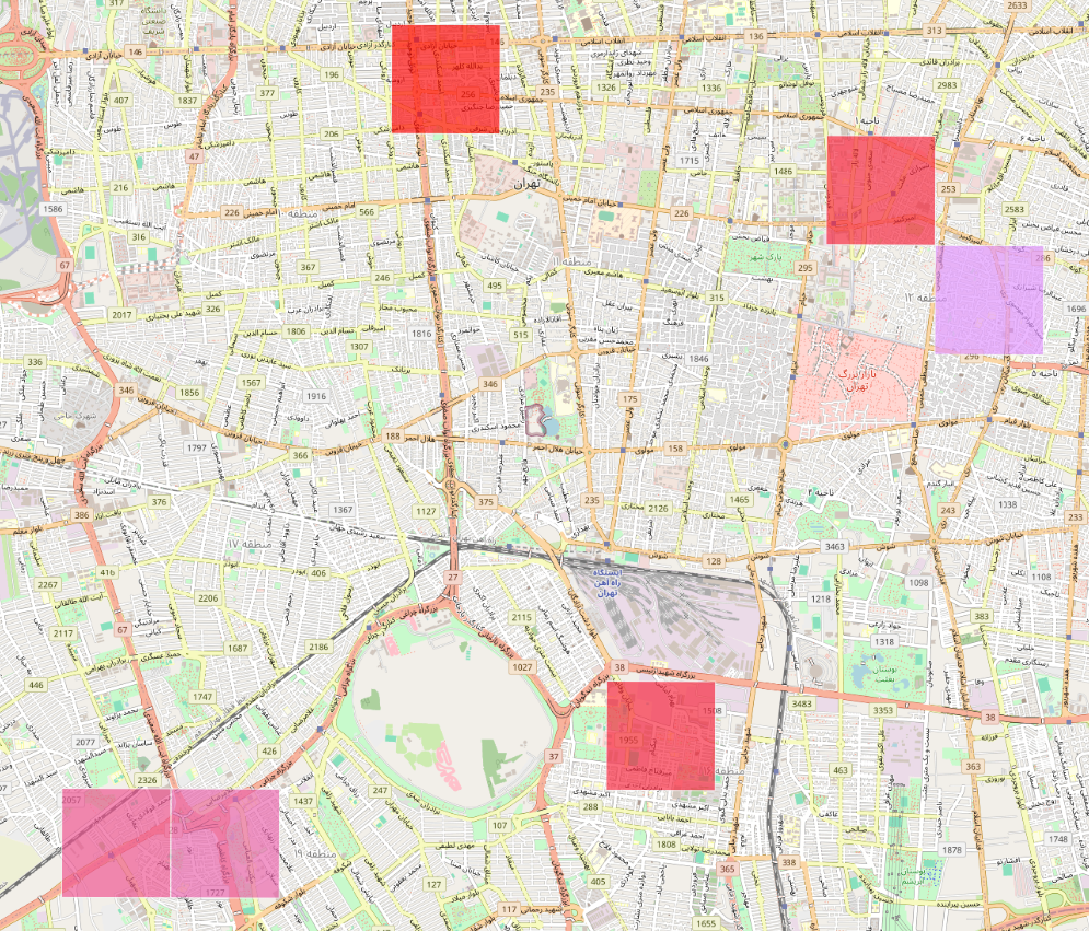 در این نقشه، نواحی با بیشترین تراکم آگهی به رنگ قرمز و نواحی با تراکم کمتر به رنگهای سردتر نمایش داده شدهاند. آنچه در نگاه اول جلب توجه میکند، تمرکز بالای آگهیها در برخی مناطق خاص شهر است.