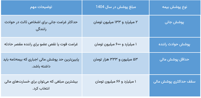 همراه با رشد نرخ دیه، مقدار پوششهای بیمه شخص ثالث هم در سال ۱۴۰۴ تغییر کرده است. پوششهای جدید بیمه شخص ثالث بر اساس اعلام بیمه مرکزی را در جدول زیر میبینید: