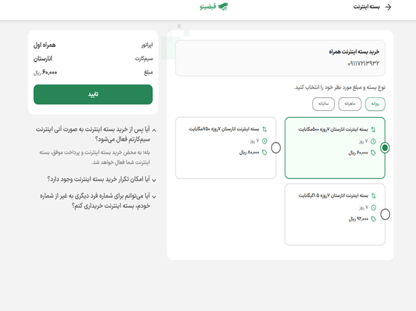 ● مرحله آخر؛ پرداخت امن و آنی: مبلغ بسته را بهصورت آنلاین بپردازید و بلافاصله پیامک فعالسازی را دریافت کنید.