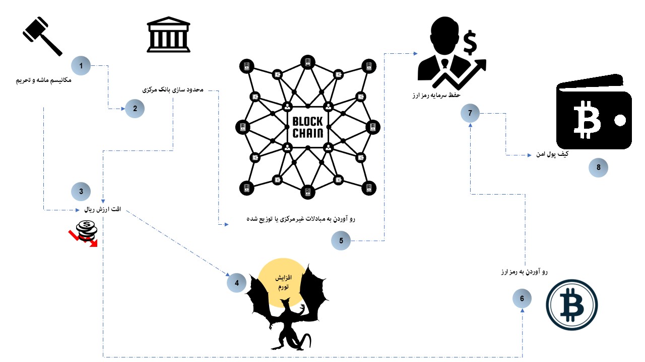 نظر شما به طرحی که بالا براتون آوردم میخواهم بدونم اما از نظر خودم این طرح به خوبی روند تحولات اقتصادی و واکنش مردم رو نشون میده. این شکل 8 مرحله پشت سر هم را نشان میدهد. مرحله ۱: فعال شدن مکانیسم ماشه و (2) تحریم بانک مرکزی؛ این مرحله هم اکنون به وقوع پیوسته که در این شرایط دست کشور برای انجام معاملات جهانی محدود میشه. مرحله 3: افت ارزش ریال؛ که نیازی به توضیح اضافه نداره، این هم الان اتفاق افتاده و فقط این رو اضافه کنم که ارزش ریال دیگه نه هزار تومان دو هزار تومن که در روز 4 هزارتومن 5 هزارتومن افت میکنه. (4) افزایش تورم؛ تا اینجا همه مشکل پشت مشکل بودن که یجورایی سیستم مرکزی مدیریت مالی کشور یعنی بانک ها و بانک مرکزی را تحت تاثیر قرار میده، این یعنی جامعه پویا و منعطف اقتصادی ایران اینبار به سراغ روش هایی میره که از روش centeralized یا مرکزیت محوری مثل بانک ها که پول را یک جا جمع میکنن و با جمع کردن به یک جا آن را مدیریت میکنند و بر آن نظارت دارند به سمتی جدید میروند و روش هایی را تست میکنند که توزیع شده است ، یعنی مبادلاتی که ناظر دولتی نداره، آیا این حرف یا اتفاق میفته؟ این اتفاق افتاده، مردم کم کم به ایلان ماسک، دونالد ترامپ و افراد ثروتمندی که با خرید و سرمایه گذاری روی رمز ارزهایی مثل بیت کوین و ... به سرمایه های فراوانی رسیدند احتمال دارد این روش را دیر یا زود تست کنند، یک جورایی مثل tor browser هست اینبار به جای اینکه یوتیوب را برای شما باز کنه، امکان مبادله با شرکت هایی فرامرزی را به شما میده شاید آمازون یا علی بابا. پس در مرحله بعد (مرحله 5 و 6 ) مردم به سرمایه گذاری در بستر های تکنولوژی جدید که امکان فیلتر و تحریم شدن را ندارند ورود میکنند. تکنولوژی هایی که دقیقا برای دور زدن سیستم مرکزیت بانکی و اعمال تحریم و تهدید مهندسی شدند، مثل بلاکچین و ارزهای دیجیتال. سیستمهای توزیعشده و سیستمهای تبادل در بستر بلاکچین سابقهای طولانیتر از دو دهه دارند. در این مدت، مبادلات بسیاری در این بستر صورت گرفته و چالشهای مختلف آن شناسایی شده است. تلاش شده تا به سوالات مهمی از جمله "چگونه یک مبادله امن داشته باشم؟" و "آیا میتوانم از رمز ارزها به عنوان ابزاری برای حفظ ارزش پول و سرمایهگذاری استفاده کنم؟" پاسخ داده شود. (یکی از بخشهای این پاسخ، مرحله ۷ است). در مرحله ۷ سرمایه شما در یک کیف پول دیجیتال شخصی ذخیره میشه، کیف پولی برای شما اما در سطحی جهانی که کل جهان آن را میفهمند و با آن خرید و فروش امن میکنند، به طوری که هیچ بانکی در هیچ جای جهان آن را کنترل و ارزش گذاری نمیکند، اگر باز هم براتون عجیبه چجوری پس یک مبادله شکل میگیره امکان کلاهبرداری هست، میشه گفتش که بدلیل شفافیت پرداخت و عدم تغییر اونها این اتفاق نمیوفته مثل یک سیستم حسابداری که همه میبینن کی چکار میکنه اما نمیتونن به دلیل سواستفاده اون رو تغییر بدن ( کتاب هایی مثل blockchain انتشارات مشهور dummies دقیق تر این مباحث را صحبت کرده.)