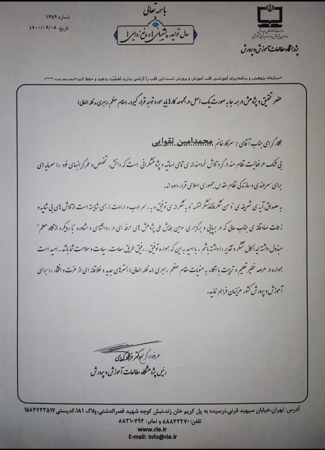 در پی برگزاری شایسته همایش ملی پژوهش های حرفه ای در روانشناسی ( موسسه استنادی پایش علوم _ isc ) ، دکتر حسین کیانمهر، رئیس پژوهشگاه مطالعات آموزش و پرورش، با اهدای لوح سپاس از تلاشها و دستاوردهای علمی محمد امین تقوایی تقدیر کرد