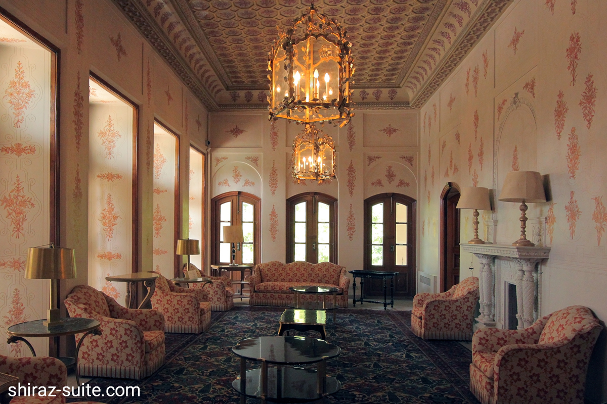 در پیشانی درب ورودی نقش دو شیر که گویی را در میان پنجه های خود گرفته اند دیده می شود. پس از گذر از در، دهلیزی وجود دارد که سقف آن را از چوب ساخته اند و با شکل های منظم هندسی مرتب کرده اند. در دیگر سوی در و بر پیشانی دهلیز مجلس تاج گذاری پادشاه ساسانی وجود دارد که بر قاب نیم دایره ای به وسیله کاشی های رنگارنگ قرار دارد. پس از گذر از دالان کوتاهی به فضای اصلی باغ می رسیم که دورادور آن را دیوار ای آجری فرا گرفته اند.