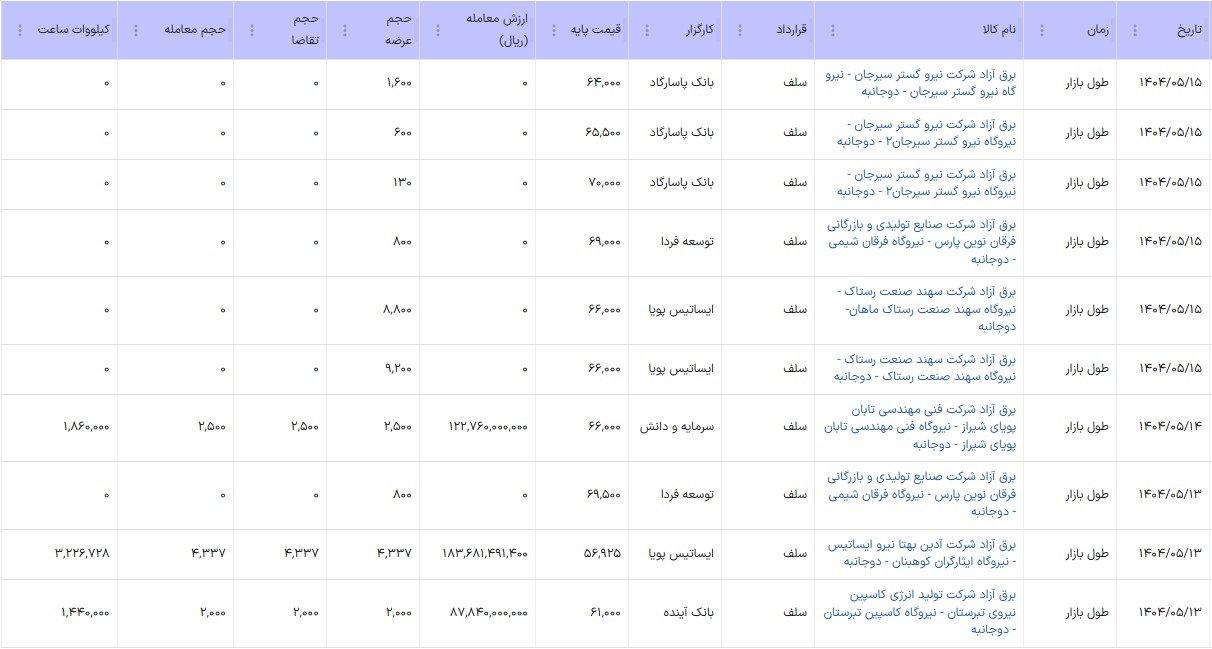 بورس انرژی ایران سه تا تالار فروش برق داره، یکی برق اصلی که قیمتش کیلوواتی ۲۰۰ تومان (۰.۲ سنت) هست، یکی برق سبز که برای فروش برق نیروگاه تجدیدپذیر مثل خورشیدی هستش و یکی هم تابلو برق آزاد با قیمت نزدیک به ۷۰۰۰ تومان (حدود ۷.۵ سنت)!