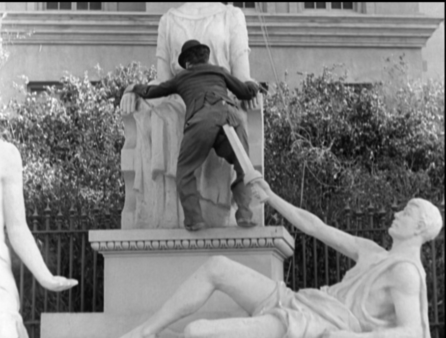 اولین بار که ولگرد را در فیلم میبینیم، او روی مجسمهای خوابیده است؛ مجسمهای که قرار است همان روز از آن رونمایی شود و بهظاهر یادبود «صلح و سعادت» است. در صحنه بعد، سیاستمدارانی را میبینیم که در حال سخنرانیاند. همین لحظات ابتدایی به ما سرنخ میدهد که نقدهای اجتماعی و سیاسی همیشگی چاپلین آرامآرام آغاز شده است.