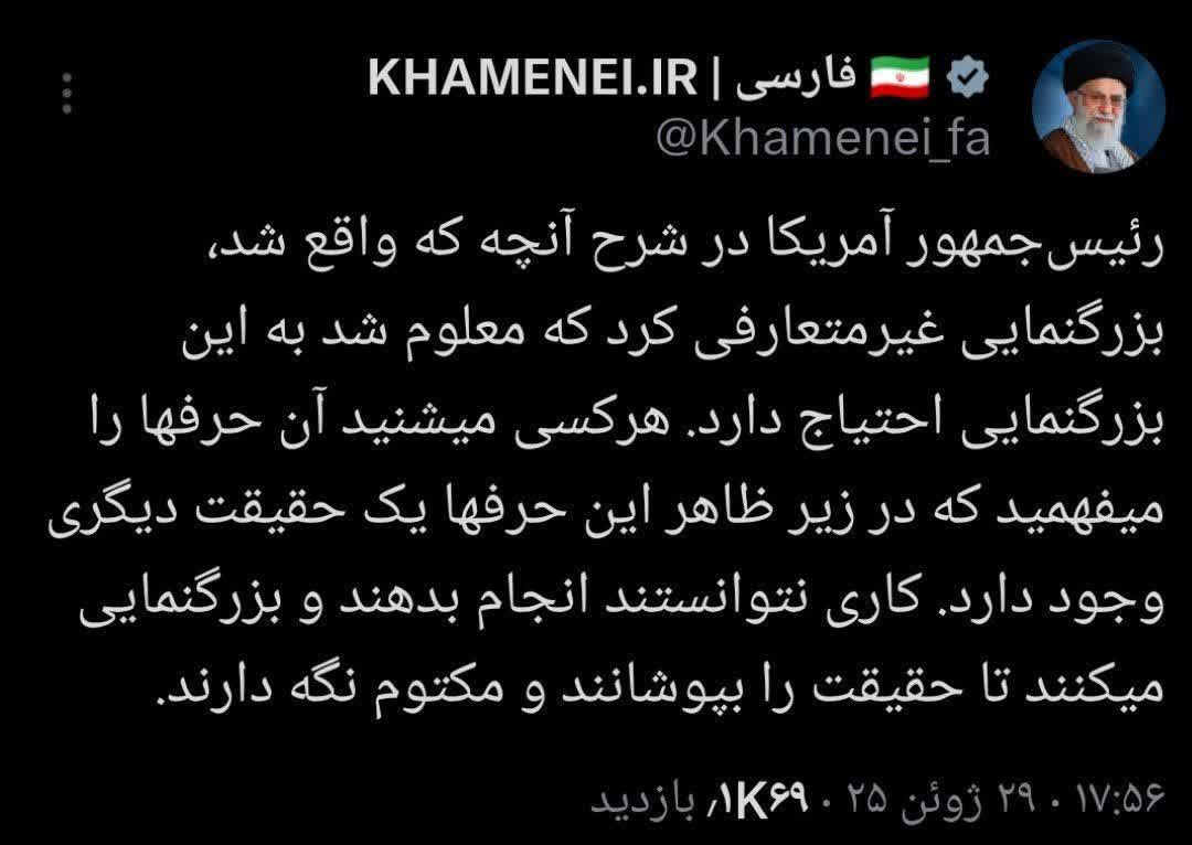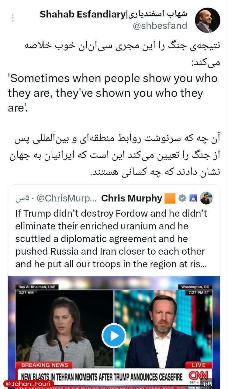 ⭕️توصیه میکنم که خسارتهایمان را کاهش دهیم و به سراغ ترامپ برویم تا این دیوانگی را با توافقی معقول متوقف کند، وگرنه مجبور خواهیم شد برای آتشبس التماس کنیم، و ایران آن را نخواهد پذیرفت