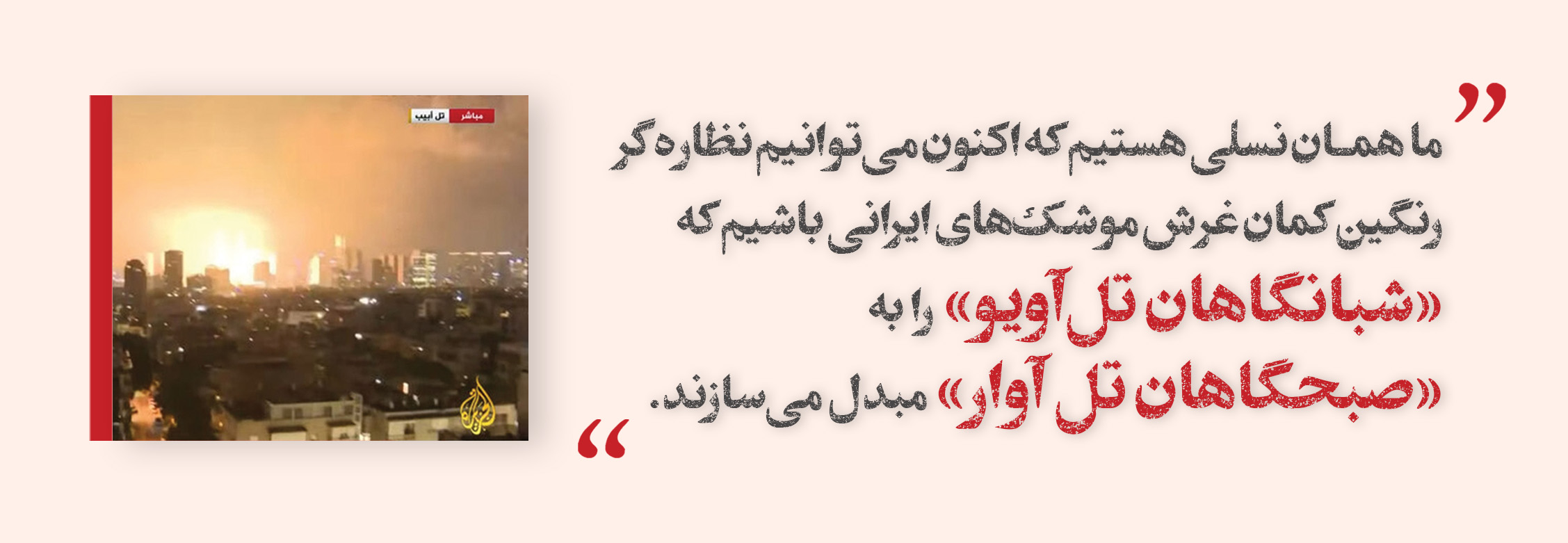 ما نسلی هستیم که معنای «تهاجم» را به خوبی درک کردهایم، به عینه دیدهایم و با آن زندگی میکنیم. تجاوز رژیم صهیونیستی به محل سفارت ایران در دمشق، به شهادت رساندن سید حسن نصرالله و اسماعیل هنیه، گویی ما را برای جنگ آماده کرد و اکنون با وجود شرایطی که شاید تا کنون جمهوری اسلامی هیچگاه شاهد آن نبوده است، همچنان به زندگی عادی خود ادامه میدهیم. چنین روحیهای را میتوان برخاسته از «ریشه داشتن در تمدنی به قدمت هزارهها» دانست؛ ما این سرزمین را به عاریه بدست نیاوردهایم که بخواهیم اکنون همانند شهرک نشینان، فرار را بر قرار ترجیح دهیم! شاهد این گفتار، فریاد تکبیرِ «الله اکبر» آن بانویی است که در هنگام تهاجم دشمن به جهان نشان داد حتی با حرکت یک انگشت دست میتوان بمباران یک رژیم را به سخره گرفت و میراثی ماندگار برای بچههای جنگ به یادگار گذاشت.