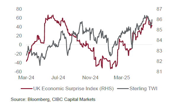 در حالی که انتظار داریم بانک انگلستان (BoE) با احتیاط به سیاست کاهش نرخ بهره ادامه دهد، اما عدم قطعیتهای مالی (fiscal uncertainty) همچنان یکی از عواملی است که میتواند باعث بیثباتی در قیمتگذاریهای بازار شود. در حال حاضر، بازار حدود ۴۵ واحد کاهش نرخ را تا گزارش سیاستگذاری پولی ماه نوامبر (پس از ارائه بودجه پاییزه) در قیمتگذاریها لحاظ کرده است. پس از آنکه اقتصاد بریتانیا در سهماهه نخست سال، سریعترین رشد فصلی خود (۰.۷ درصد نسبت به فصل قبل) در چهار فصل گذشته را تجربه کرد، انتظار میرود فعالیت اقتصادی بهطور محسوسی کاهش یابد. ضعف شاخصهای کلان در ابتدای فصل عمدتاً ناشی از واکنش مصرفکنندگان به ترکیب افزایش قیمتهای تعیینشده (administered prices) و افزایش مالیاتها بود. با وجود نگرانیها در مورد تضعیف بازار کار، طی سه سال گذشته تعداد فرصتهای شغلی ۵۶۴ هزار مورد کاهش یافته، اما دستمزدهای واقعی همچنان مثبت باقی ماندهاند. همچنین، شاخص اعتماد مصرفکننده GfK و/یا PMI بخش خدمات (نسخهی اولیه/فلش) حاکی از آناند که رشد تولید ناخالص داخلی در فصل جاری تقریباً نصف سرعت رشد فصل اول سال خواهد بود. با این حال، بازگشت شاخص PMI اولیه و نشانههایی از حرکت بازده اوراق قرضه ۱۰ ساله دولتی بریتانیا (Gilt) بهسمت میانه بازه یکساله خود (نزدیک به ۴.۳۲ درصد)، نشان میدهد که نگرانیها در خصوص سیاستهای مالی انقباضی(fiscal tightening) هنوز نباید بیش از حد بزرگنمایی شوند – هرچند که نمیتوان ریسکها را نادیده گرفت. اگرچه شاخص شگفتی اقتصادی بریتانیا (UK Economic Surprise Index) همچنان در سطح بالایی قرار دارد، اما اصلاح آن از سطوح نزدیک به بالاترین سطح یکسالهاش، نشاندهنده احتمال تثبیت (consolidation) در کوتاهمدت است. با اینوجود، ما انتظار داریم که هرگونه کاهش فوری در نرخ پوند باعث خریداری این ارز شود، چرا که نرخ GBP/USD بهسمت اوجهای سپتامبر ۲۰۲۱ در حوالی ۱.۳۹ تا پایان سال میلادی حرکت خواهد کرد.