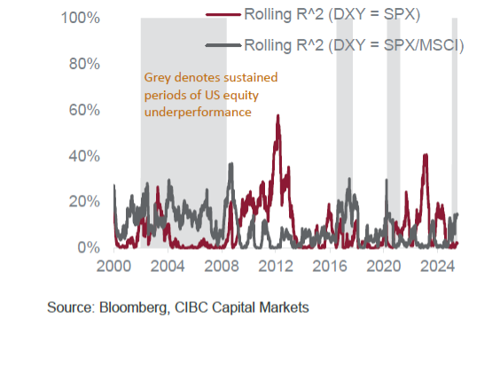 با توجه به افزایش نرخ پسانداز شخصی و اثر فعلاً محدود تعرفهها بر شاخص قیمت مصرفکننده (CPI)، انتظار داریم که حاشیه سود شرکتها در حال کاهش باشد. در گذشته شاید این موضوع تأثیر چندانی بر دلار نداشت، اما در شرایط فعلی، نمیتوان آن را نادیده گرفت. در نمودار پایین، بهروشنی دیده میشود که دلار آمریکا در حال حاضر بیشتر تحت تأثیر عملکرد نسبی بازار سهام آمریکا در مقایسه با بازارهای جهانی قرار دارد، زیرا سرمایهگذاران خارجی نگران تاثیر زیاد داراییهای آمریکایی هستند. به همین دلیل، ما انتظار داریم که ضعف در دادههای اقتصادی آمریکا و کاهش حاشیه سود شرکتها، باعث تداوم عملکرد ضعیفتر بورس آمریکا نسبت به بازارهای جهانی شود و همین موضوع دلار آمریکا را نیز بیشتر تحت فشار قرار خواهد داد.