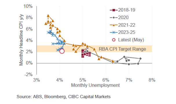 نشست RBA در ۸ ژوئیه، تنها یک روز پیش از ضربالاجل تعیینشده توسط ترامپ برای تعرفههای متقابل در ۹ جولای برگزار میشود. از این رو، احتمال اندکی وجود دارد که RBA رویکرد «صبر بدون اقدام» را در پیش بگیرد و منتظر یک توافق تجاری احتمالی میان آمریکا و استرالیا بماند. با این حال، بهنظر ما، تورم شاخص قیمت مصرفکننده (CPI) بهاندازه کافی کاهش یافته تا RBA بتواند دوباره اقدام کند. با اینکه بازار کار نسبتاً سالم است و نرخ بیکاری ۴.۱٪ است، اما «منحنی فیلیپس» استرالیا نشان میدهد که اشتغال محدود دیگر باعث ایجاد مارپیچ دستمزد–قیمت نمیشود (نمودار را ببینید).