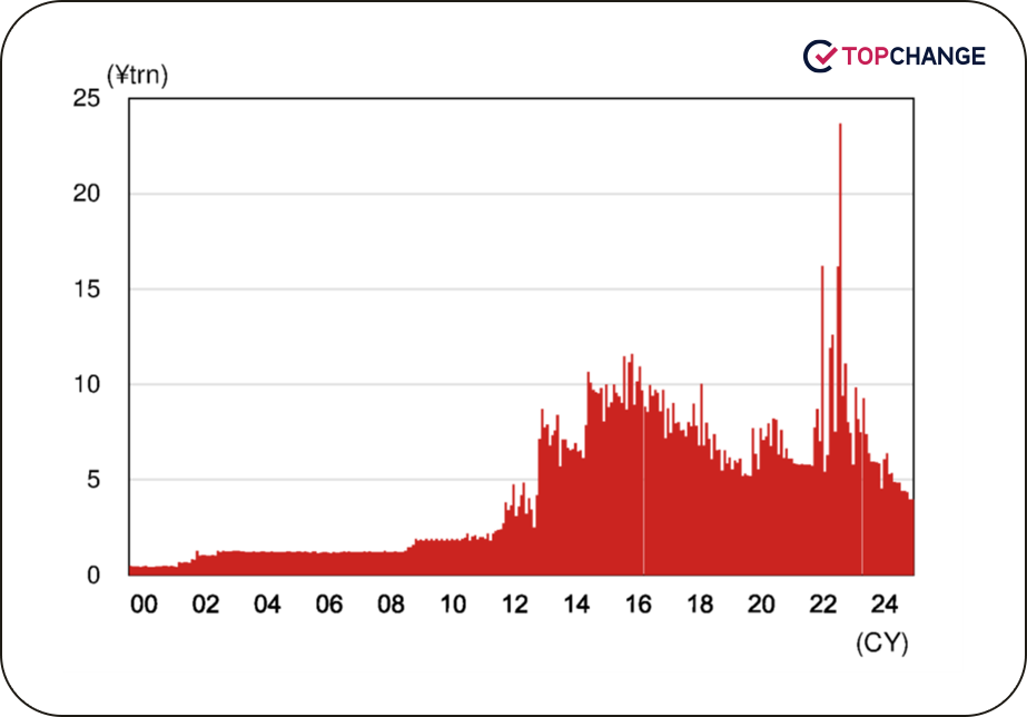 در نشست ژوئن، قرار است بانک مرکزی ارزیابی میاندورهای از تصمیمی که در نشست جولای ۲۰۲۴ برای کاهش خرید اوراق قرضه دولتی اتخاذ شد، ارائه دهد. بر اساس گزارشهای نظری، بهنظر میرسد که بانک مرکزی در حال بررسی این موارد است: (1) ادامه برنامه فعلی تا پایان مارس ۲۰۲۶ (کاهش خرید اوراق به میزان ۴۰۰ میلیارد ین در هر فصل)، (2) تمدید دوره کاهش خریدها از آوریل ۲۰۲۶ به مدت یک سال دیگر، همراه با کاهش سرعت روند کاهش (که در ادامه بیشتر به آن میپردازیم).