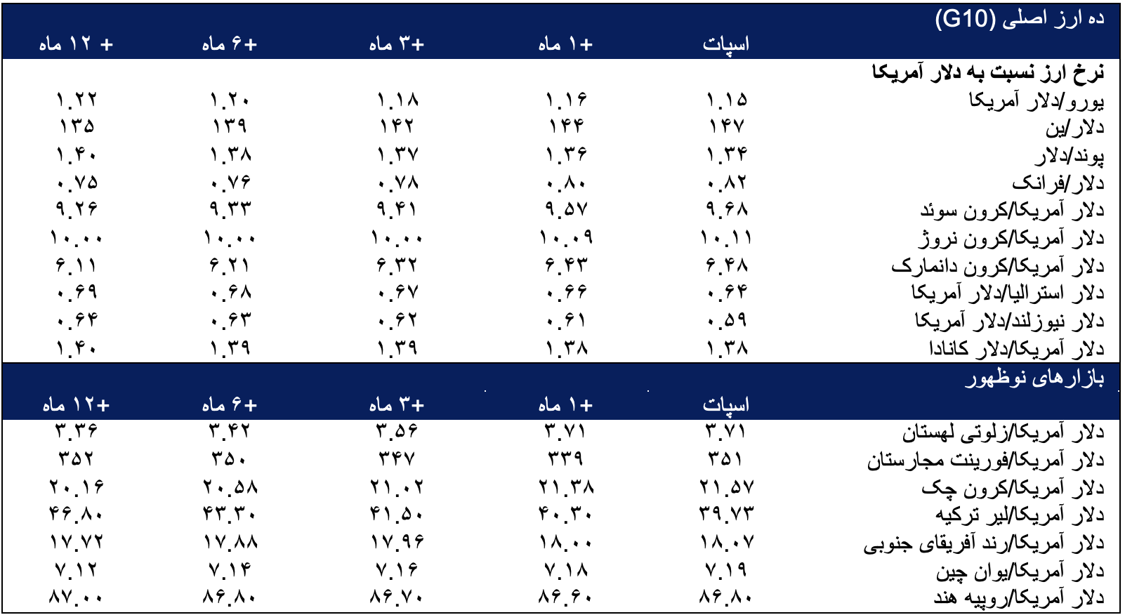 •جمعبندی: ما انتظار داریم که نرخ USD/CNY (دلار آمریکا/یوان چین) همچنان مسیر کلی دلار آمریکا را دنبال کند؛ همانگونه که اخیراً نیز این روند مشاهده شده است. از آنجا که در پیشبینی جدید خود، مقداری ضعف بیشتر برای دلار آمریکا در نظر گرفتهایم، پروفایل USD/CNY را نیز اندکی کاهش دادهایم: از ۷.۱۶ به ۷.۱۴ در افق ششماهه و از ۷.۱۵ به ۷.۱۲ در افق دوازدهماهه.
