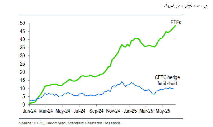 نمودار ۲: جریان خالص ورودی به ETFها در مقایسه با پوزیشنهای شورت صندوقهای پوشش ریسک در CFTC
