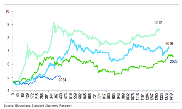 نکته کلیدی این بار آن است که آیا جریانهای ورودی از مسیر ETFها و خزانهداری شرکتها میتوانند فروش احتمالی از سوی دارندگان بلندمدت را جبران کنند یا نه. ما معتقدیم که چنین خواهد شد؛ در واقع انتظار داریم که خالص جریانهای ورودی از این دو مسیر در سهماهه سوم و چهارم حتی قویتر از سهماهه دوم باشد. در چرخههای قبلی هاوینگ، این منابع جریان سرمایه یا اصلاً وجود نداشتند یا بسیار محدود بودند. بهنظر ما، همین عامل میتواند روند ریزشهای شدید پس از اوج قیمتهای پس از هاوینگ را بشکند. پس از آنکه نگرانیهای بازار درباره این موضوع فروکش کند، ما انتظار داریم که قیمت بیتکوین به رشد خود ادامه دهد و به پیشبینیمان برای پایان سهماهه چهارم یعنی ۲۰۰٬۰۰۰ دلار برسد.
